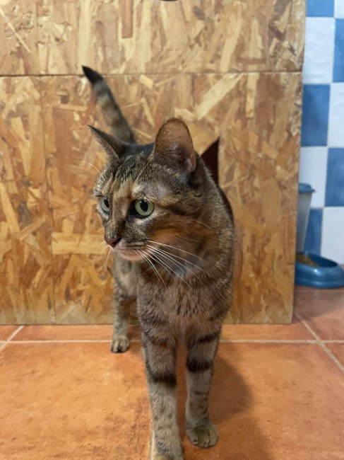 Sabemos que las fincas no son un buen lugar para un gato así que la convencimos para que nos la cediese y poder así buscarle una familia que la cuide en casa.