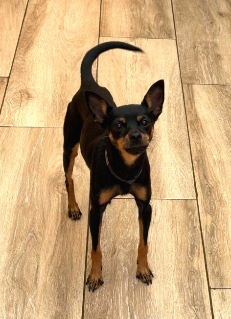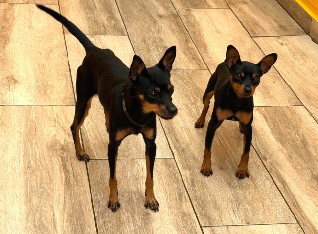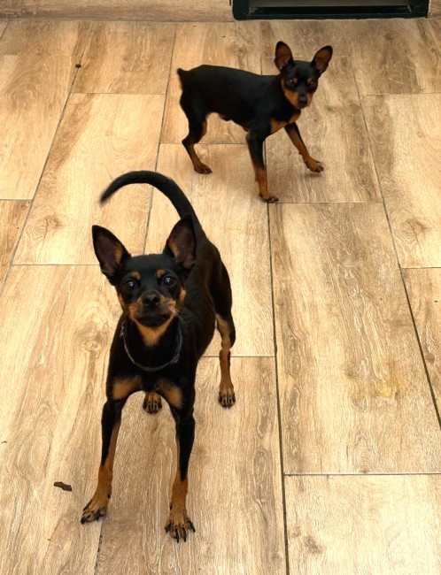 Estos dos pinscher (Aprilia y Gresini), comparten la misma raza, pero fueron recogidos en fechas diferentes, aunque en la misma zona de una autovía.