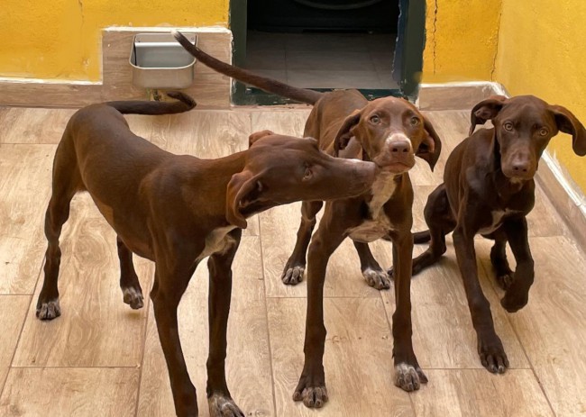 A estos tres hermanitos color chocolate los abandonaron en el campo cerca de un campo de deportes, un chaval que jugaba al futbol los vio y los recogió para ponerlos a salvo. Los llevó al centro del CIMPA que estaba cerca y allí los acogieron. Legaron llenos de pulgas y extremadamente delgados, lo que indica que el principio de su vida ha sido bastante desgraciado.