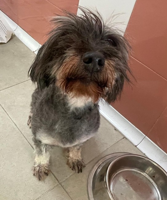 Nos avisó la policía de un pueblo cercano, habían recogido a una perra en mal estado y como tenemos contrato de recogida con ellos, fuimos a la comisaría a por ella. Era un montón de pelo enredado y lleno de rastas, tras raparle el pelo se ha quedado en la mitad