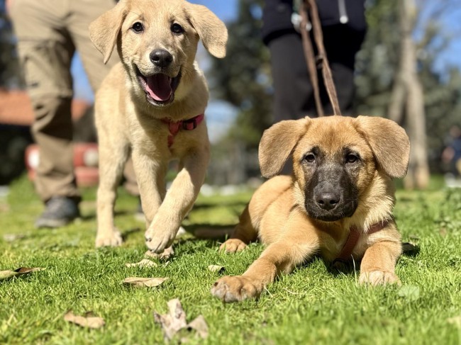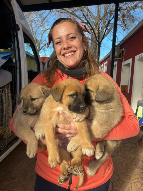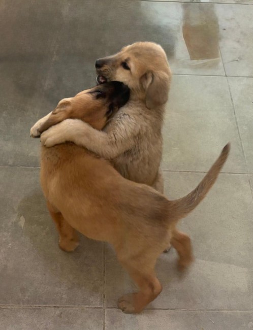 Tienen 3 meses y pico y todo apunta a que serán de tamaño más bien grande, probablemente cruce de mastín. Son súper ricas, dulces y achuchables.