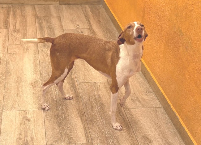 A Canela la adoptó un señor en una perrera, ha vivido varios años con él, pero ha sufrido un desahucio y en la habitación donde ha podido alojarse, no admiten perros, nos ha pedido ayuda y está en nuestro albergue.