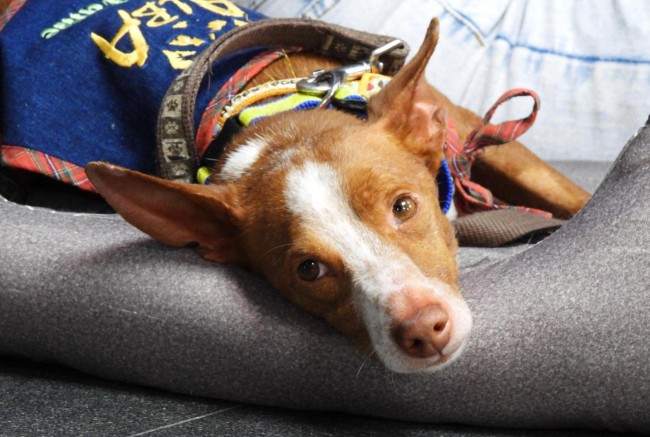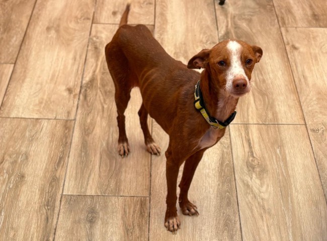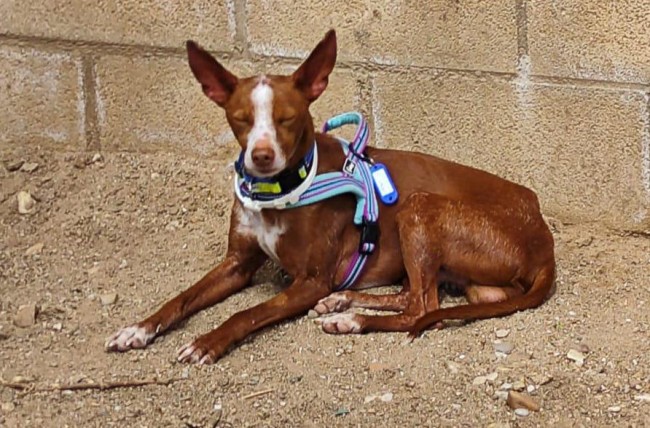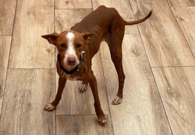 Frijolito andaba perdido por la carretera, en uno de los municipios donde tenemos contrato de recogida. En el albergue comprobamos que tenía chip y tras unos análisis que estaba bastante enfermo, una leishmania avanzada.