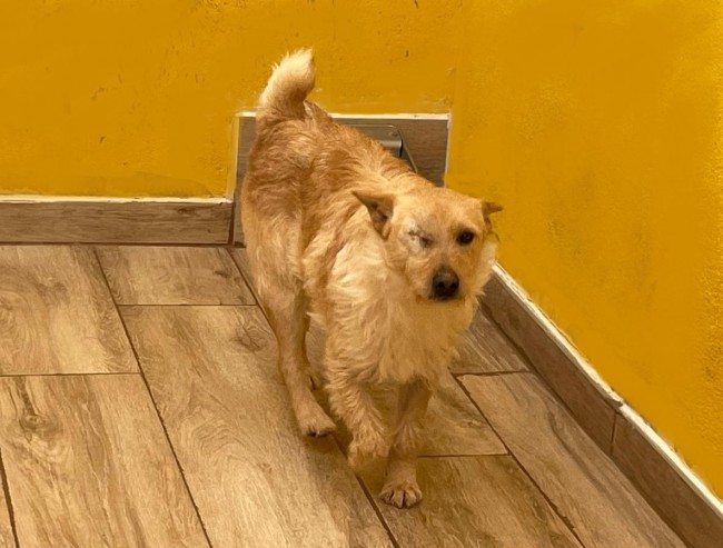 Es un perro alegre y sociable, convive con sus compis de viaje 2 hembras y un macho. Le falta el ojito derecho.