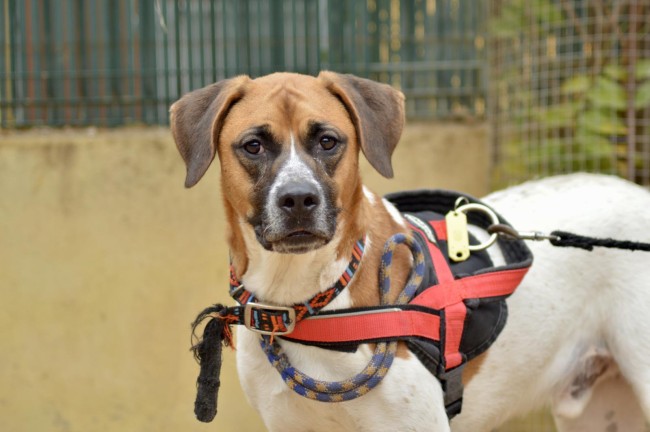 Habiendo ganado su confianza y sabiendo que no teníamos ninguna intención de hacerle daño, Oporto está cómodo con el arnés y la correa y pasea como un perrito más cuando el albergue ya está más tranquilo y vacío.