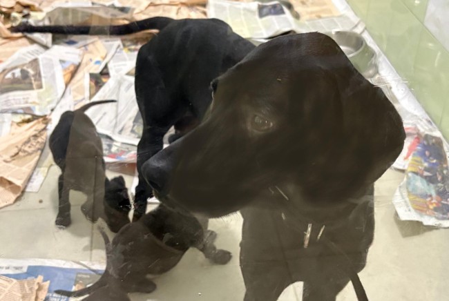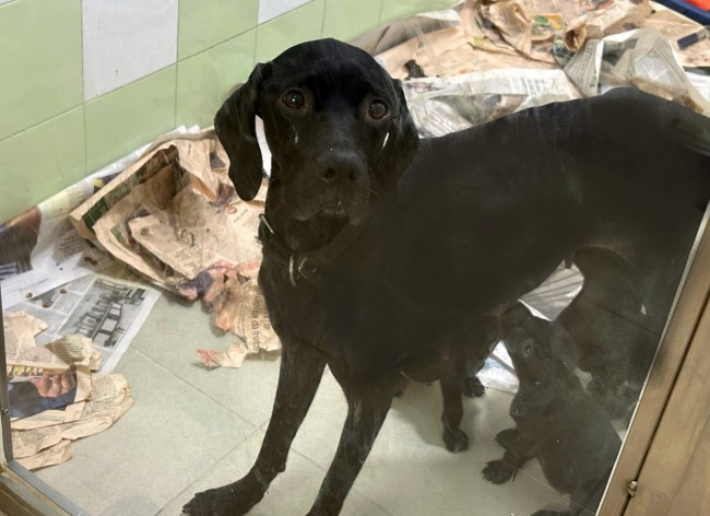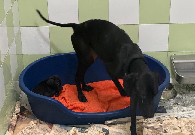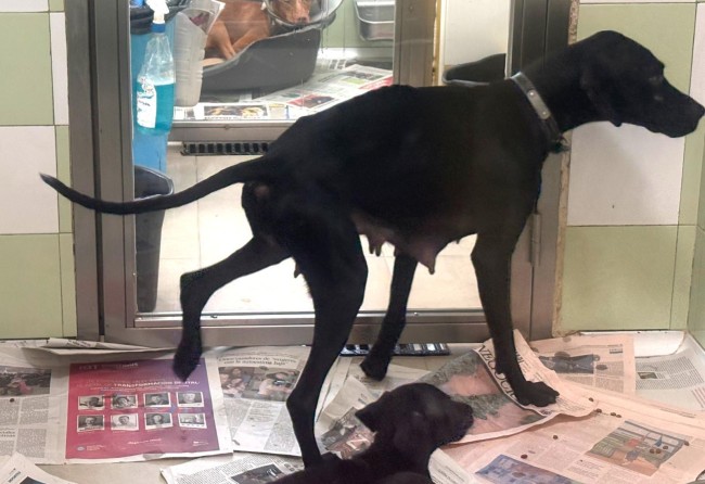Durante las últimas borrascas, una protectora amiga sufrió graves daños y se quedó sin tejado en los cheniles. Desde Alba acogimos a algunos de los perros para aliviar la situación; entre ellos estaban Silvia y sus 7 cachorros.