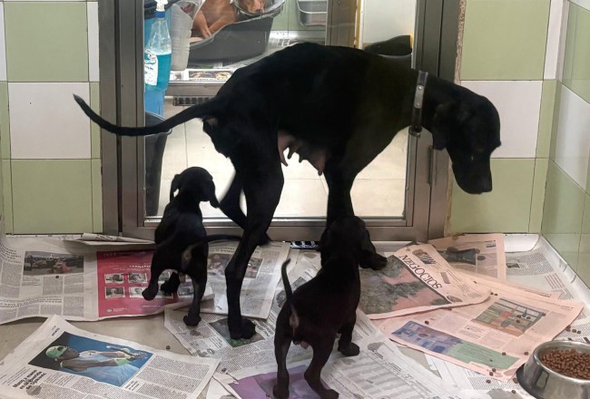Silvia es una perrita de 3 años que fue encontrada en la calle, rondando al lado de una caja de fruta cerrada. Cuando abrieron la caja, había siete cachorros de menos de un mes. Silvia no se separaba de ellos. Criar a tantos pequeños la ha dejado exhausta, pero Silvia es una luchadora.