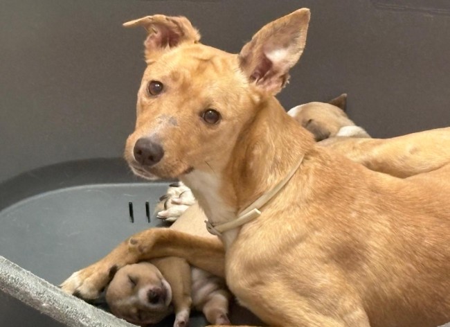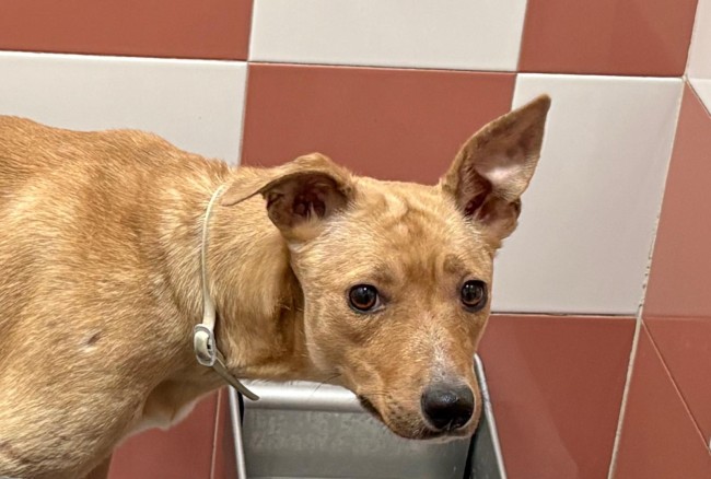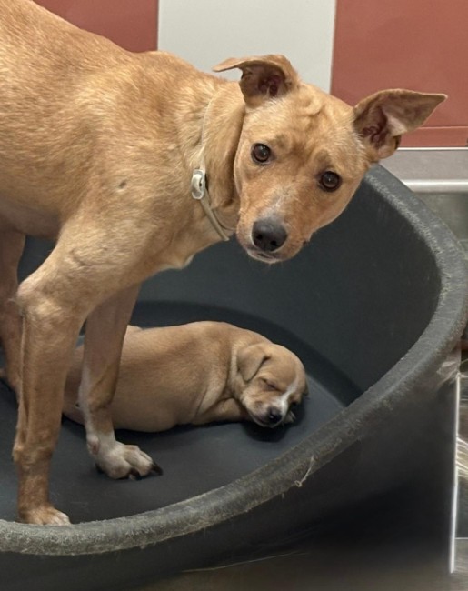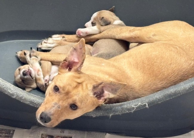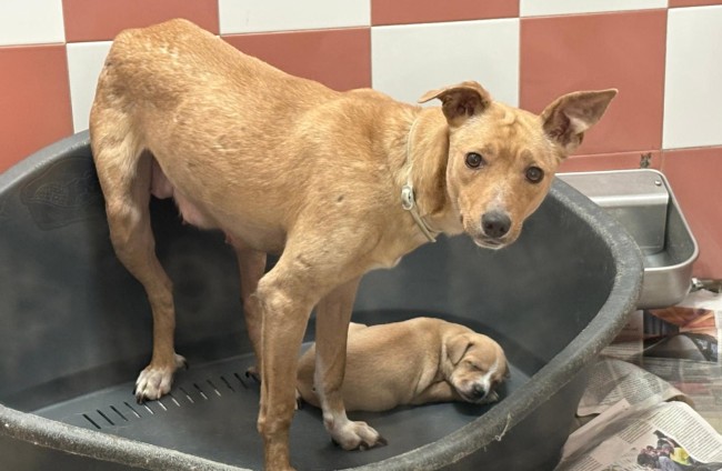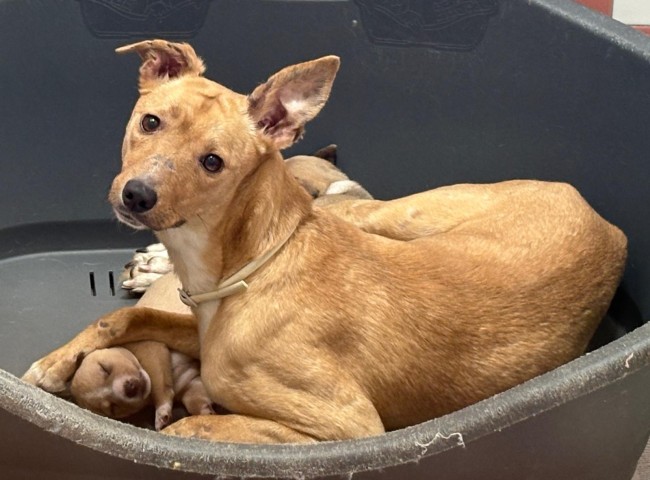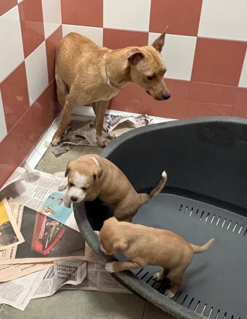 Rescatada de una finca durante una incautación, donde había muchos perros en muy malas condiciones. Estaba a punto de parir y parió en el traslado a 4 criaturas, desgraciadamente en los primeros días fallecieron dos.