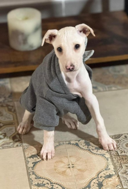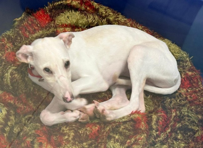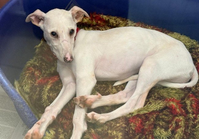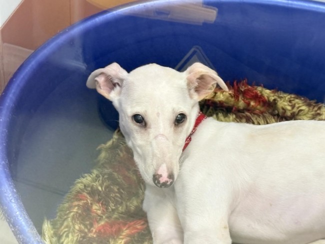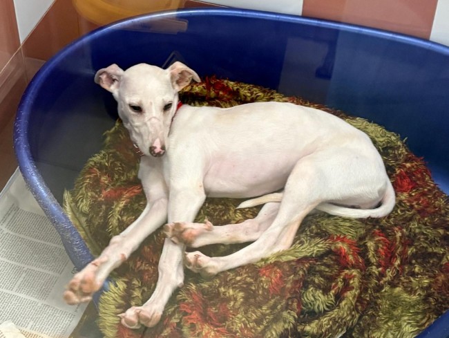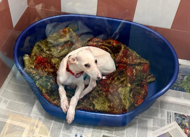 A Zelda la encontraron abandonada en el campo, es una mestiza de galgo, solo tiene 4 meses y ya la han abandonado. Triste destino de los perros de caza .