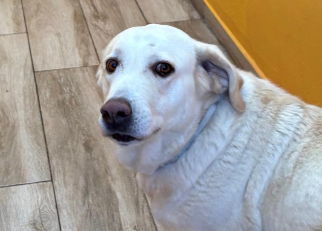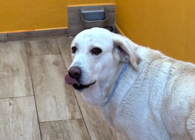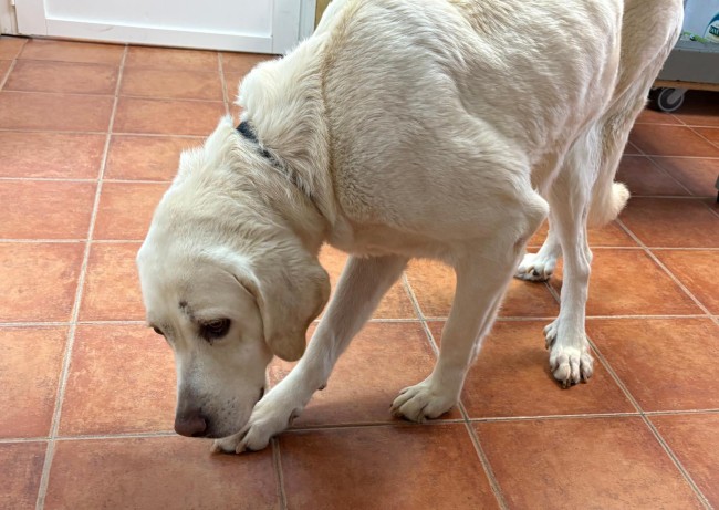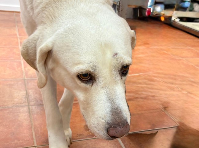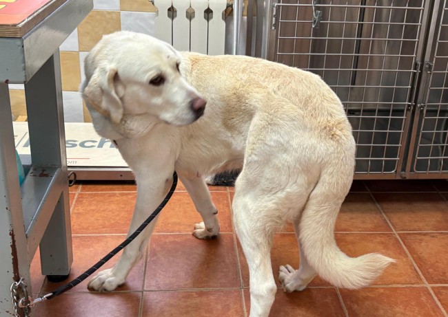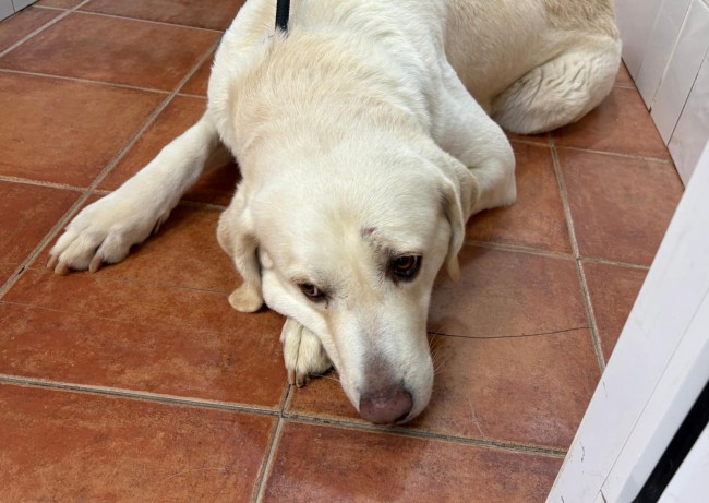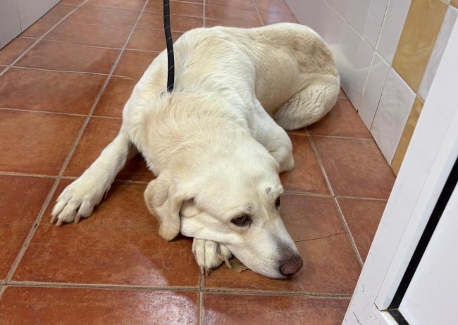 No sabemos nada de su origen, seguramente escapada de alguna finca, pero está sana y no tiene signos de maltrato, solamente algo tímida, se plancha en el suelo.