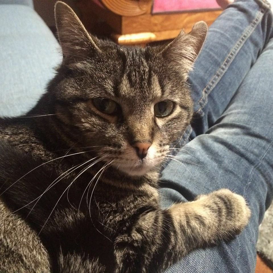 Rescatada con tres meses de una fábrica de camiones donde corría mucho peligro. Es una gatita muy cariñosa, pero no tolera a los veterinarios, ni los cambios. Le cuesta adaptarse a ellos, pero cuando lo hace es una gatita muy cariñosa y mimosa.
