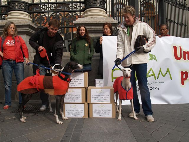 Isabel, 1, de 1 300 000 firmas solicitando la creación de una ley marco de protección animal. A su vez a las 13h varios componentes de la FAPAM han sido recibidos por Doña Alicia Villauriz Secretaria General del Medio Rural. En la reunión se ha expuesto la problemática existente en España en temas de protección animal. En la actualidad existen 17 leyes de protección animal autonómicas muy distintas entre ellas, lo que hace que un animal este más o menos protegidos según donde ocurran los hechos.