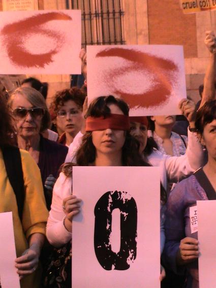 El grupo de mujeres allí reunidas, autodenominados “Mujeres por una sociedad libre de violencia hacia personas y animales” defendió la naturaleza empática de la mujer y negaron su papel de cómplice de la tortura del toro, como sugiere el cartel, y por lo tanto a ni ser maltratadas ni maltratadoras.