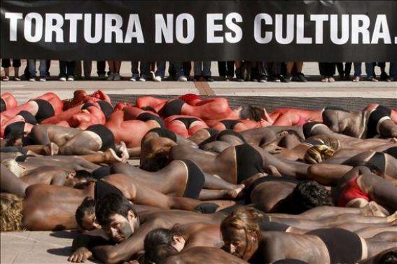 Un grupo de antitaurinos, semidesnudos y pintados de rojo y negro, han formado hoy con sus cuerpos la figura de un toro sangrante ante la plaza de Las Ventas para exigir que la Asamblea de Madrid debata la Iniciativa Legislativa Popular (ILP) que pretende prohibir la «fiesta» en esta comunidad autónoma.