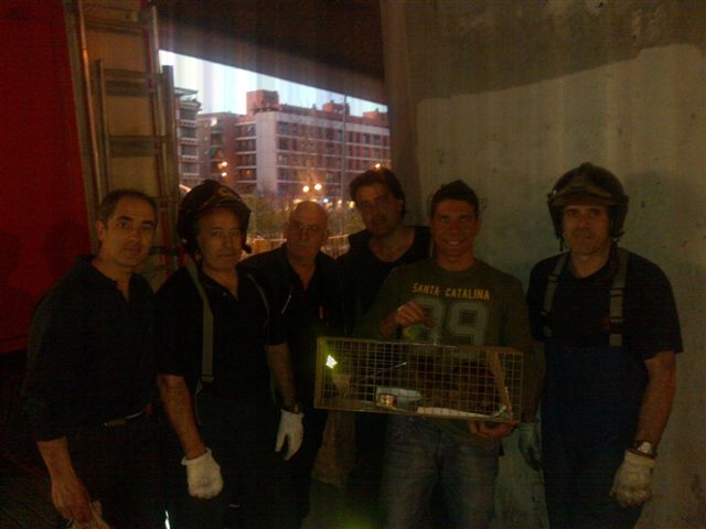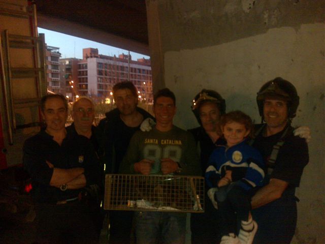 Juan sube de nuevo por la escalera de los bomberos y coloca otra jaula-trampa más pequeña. En el corrillo que se ha formado, la expectación aumenta y se hace el silencio…CLIK ahora sí ha entrado y suben a por ella rápidamente «Ya está salvada» y el público aplaude, Juan se abraza a los bomberos y le invitan a comer a su cuartel. Han sido dos horas de duro trabajo.