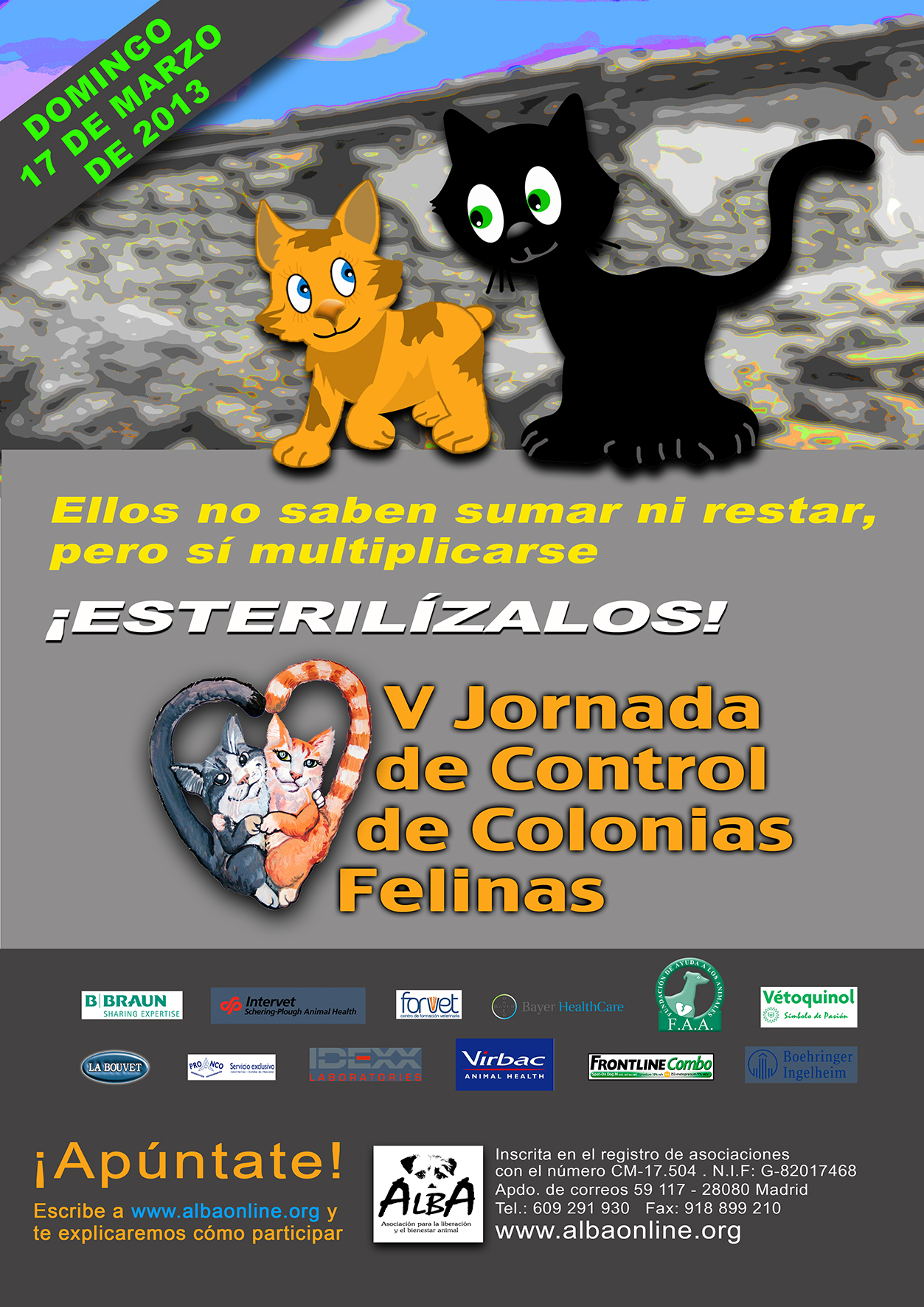 Como cada año llegan a la Asociación para la Liberación y el Bienestar Animal (ALBA) las Jornadas de control de Colonias Felinas, en esta ocasión será el domingo 17 de marzo. Estamos convencidos de que las colonias de gatos pueden convivir con el resto de personas siempre que estén controladas. De hecho, según muchas opiniones son beneficiosas para el entorno ya que colaboran en el equilibrio ecológico del entorno.